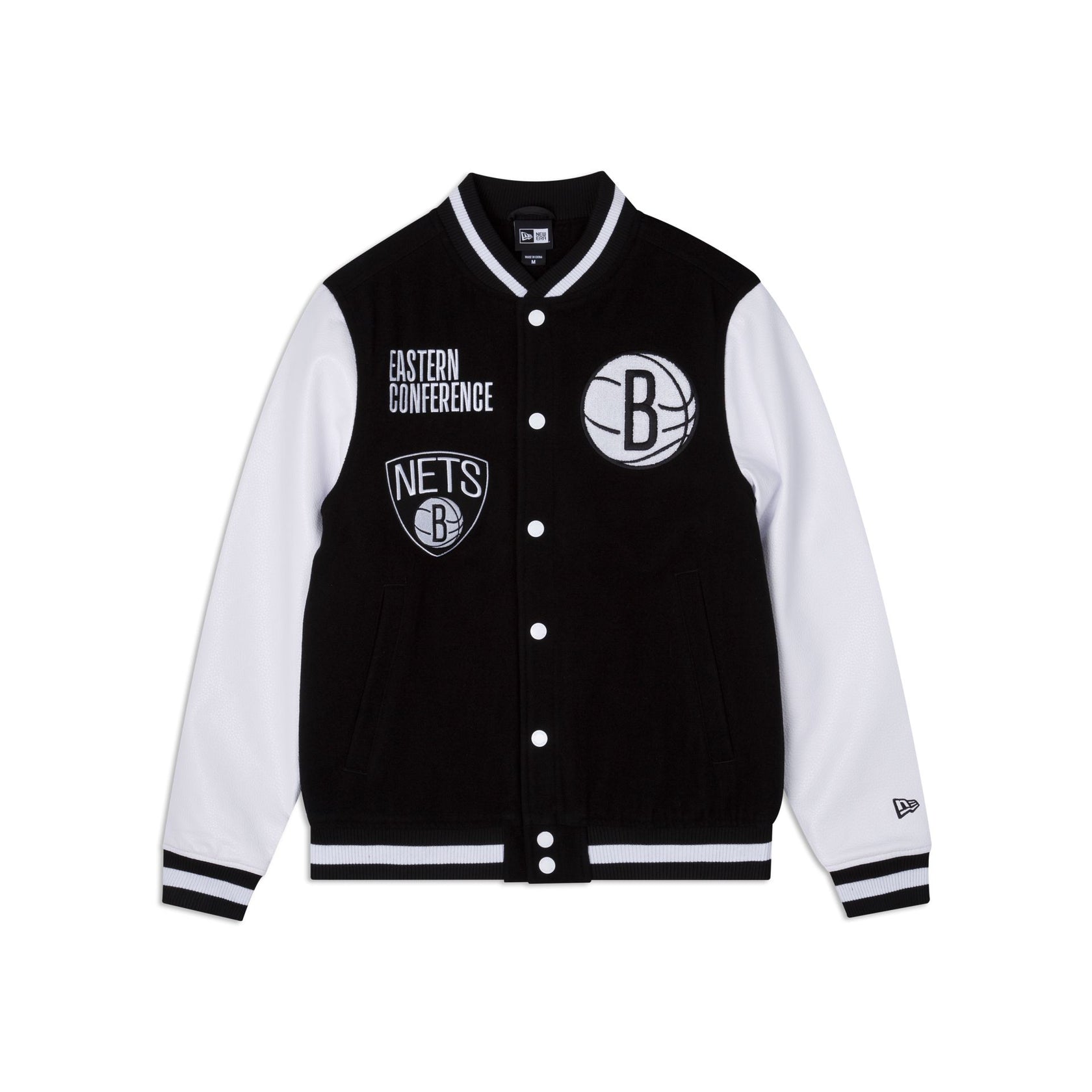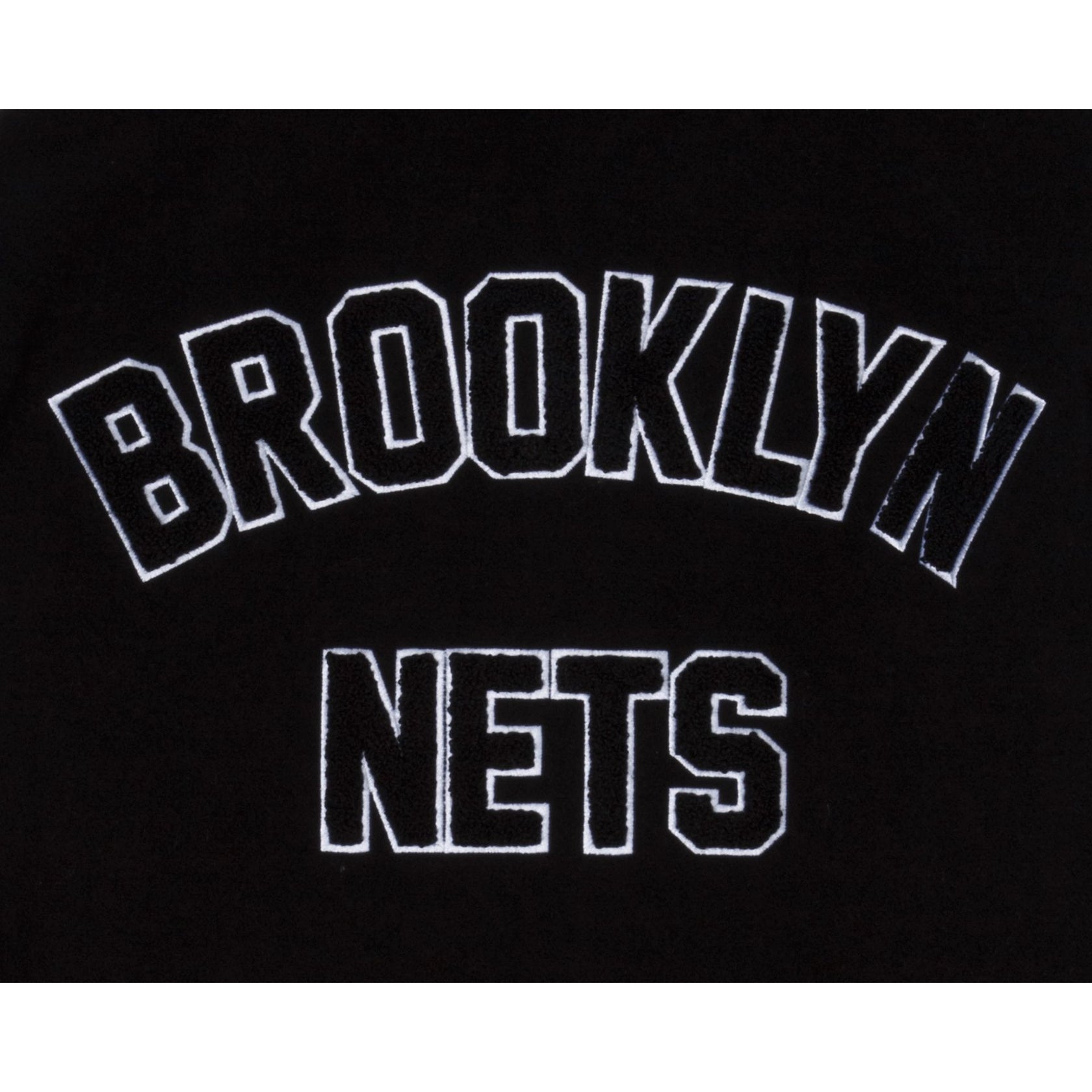 The Brooklyn Nets Black Varsity Jacket features a chenille applique Nets logo at the left chest with the team's conference and logo at the right chest. Additional details include a chenille applique team wordmark at the rear.