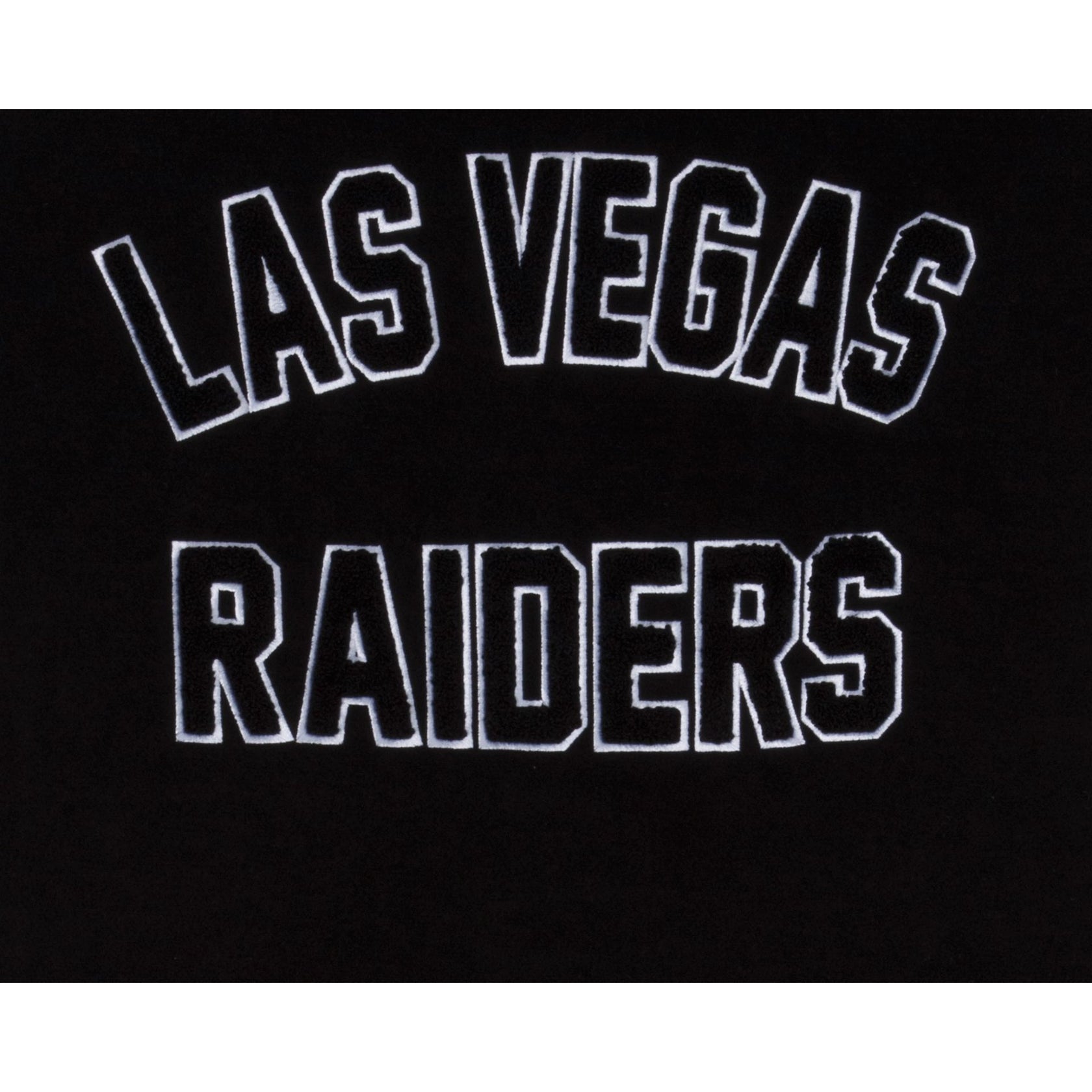 The Las Vegas Raiders Black Varsity Jacket features a chenille applique Raiders logo at the left chest with the team's conference and logo at the right chest. Additional details include a chenille applique team wordmark at the rear.