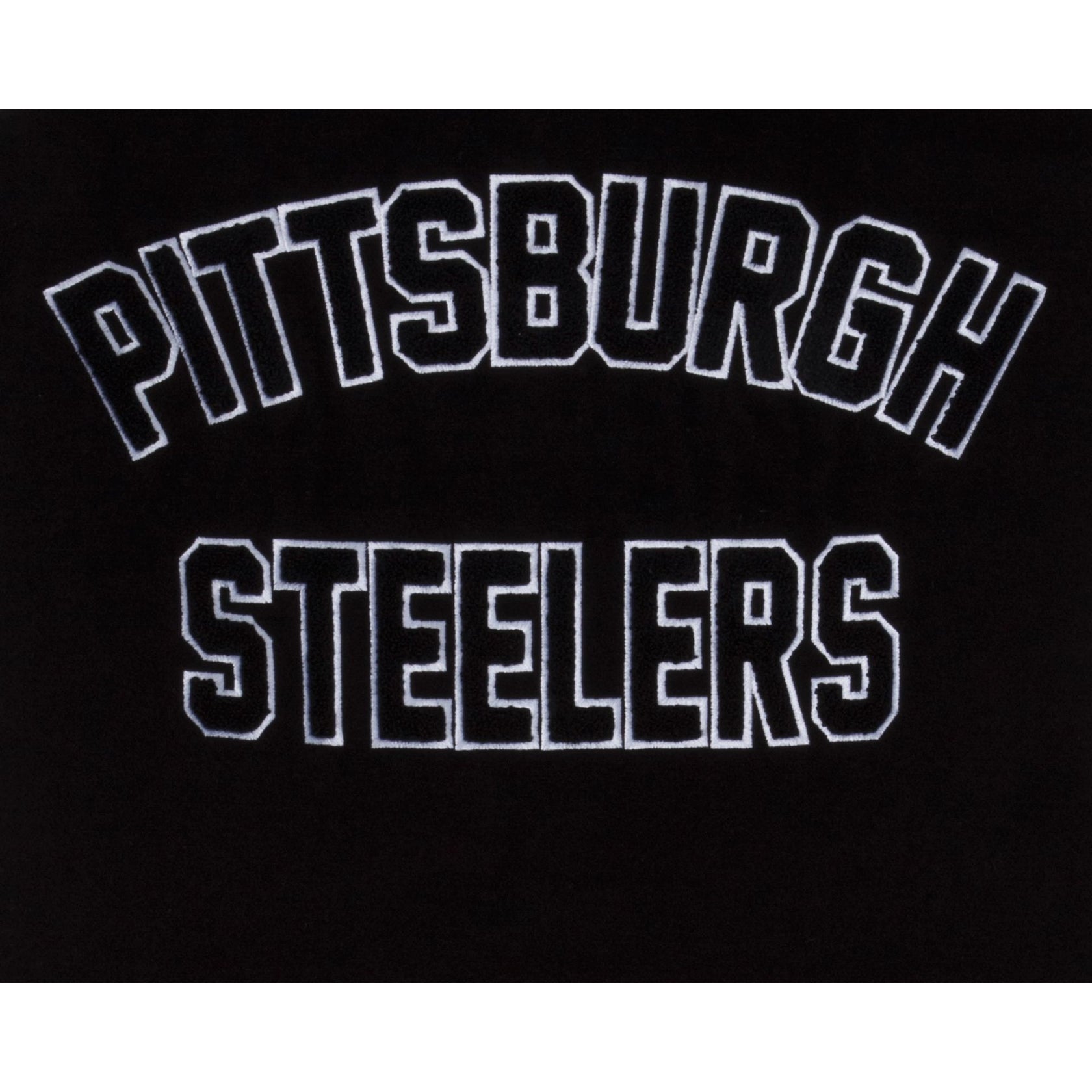 The Pittsburgh Steelers 3rd Down Jacket features an embroidered Steelers logo and conference patch with a team wordmark at the front and a chenille team name at the rear. Additional details include pebbled sleeves and a snap button closure.
