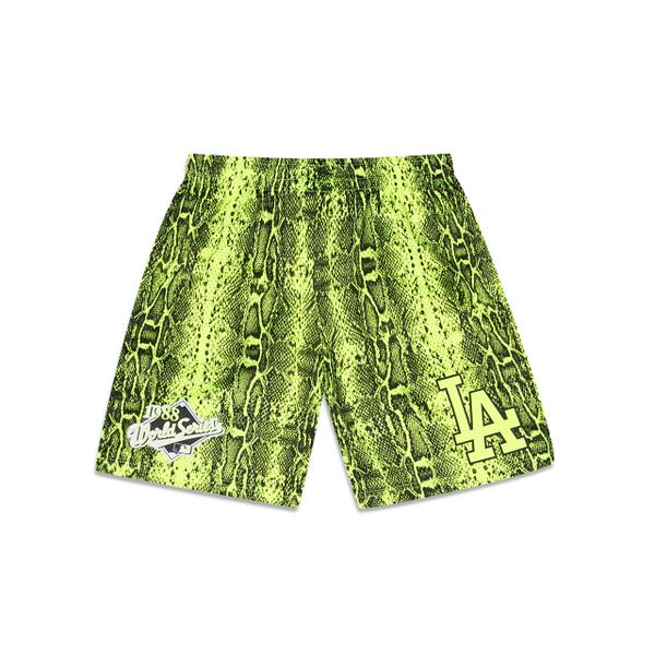 The Los Angeles Dodgers Summer Pop Yellow Shorts feature an all over yellow snakeskin pattern with a screen-printed Dodgers logo at the left leg and a 1988 World Series logo at the right leg.