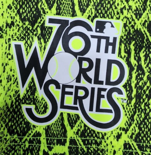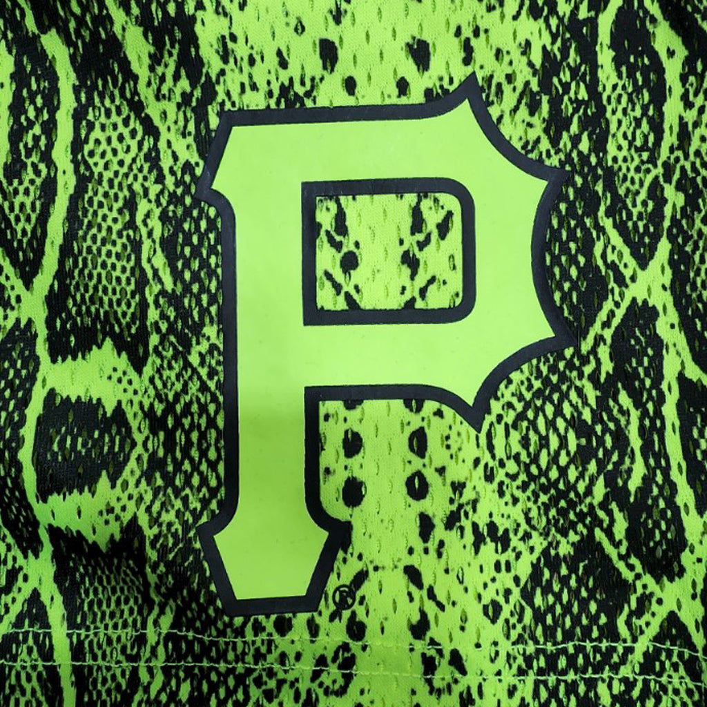 The Pittsburgh Pirates Summer Pop Yellow Shorts feature an all over yellow snakeskin pattern with a screen-printed Pirates logo at the left leg and a 76th World Series logo at the right leg.