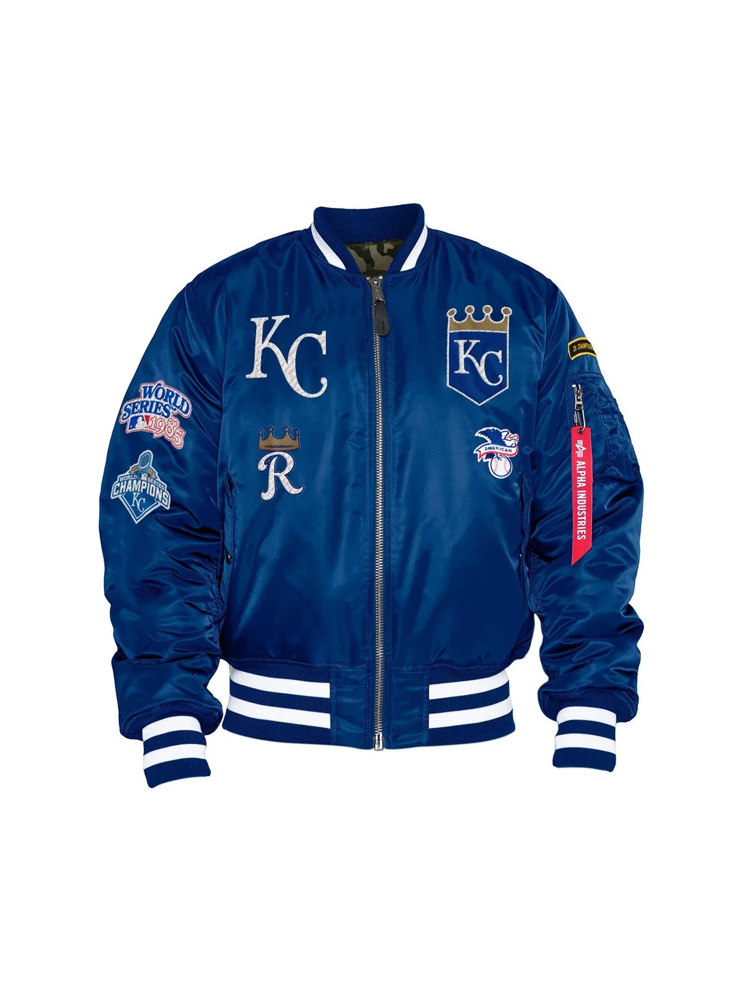 Add a new spin to any Kansas City Royals look with this must-have Bomber Jacket. This Alpha Industries X New Era full-zip jacket features bold graphics celebrating the team's history, an eye-catching blade collar and elastic cuffs for extra warmth. Stay warm while adding a unique touch to any fan look with this striking Kansas City Royals jacket.